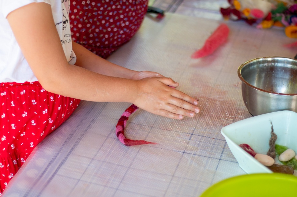 Amíg beszélgettünk, addig a filagória középső részén elhelyezkedő kis asztalnál Emőke, egy kolléganője segítségével, a gyerekekkel foglalkozott, kígyót nemezeltek. Látva a kis szorgos kezeket, fel is tevődött bennem a kérdés, hogy mi az, ami nemezből megvalósítható? Igazából bármi, érkezett is rögtön a válasz.
