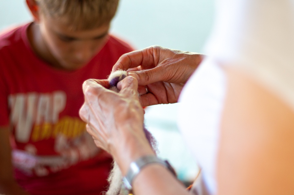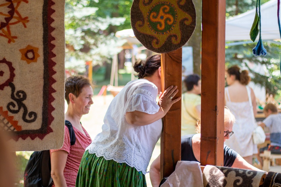 A nemezelés nem csak az ősmagyarok körében volt elterjedt technika, a 20. MES alkalmával a gyerekek és felnőttek körében is nagy népszerűségnek örvendtek a gyapjúból készülő használati tárgyak, kiegészítők és játékok. A sétatér közepén található filagóriánál Molnár Melindával és Szélyes Emőkével beszélgettem.