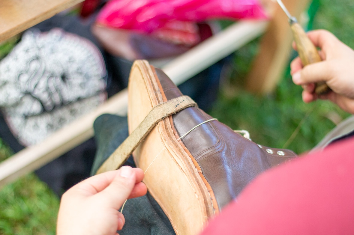 A cipész sátor bejáratához érve, egy pöttyös terítővel letakart asztalt pillantottam meg, rajta az Artera Alapítványnál tanuló másodéves hallgatók vizsgamunkái sorakoztak. A cipők mögött az előtérben a végzős hallgatók munkálkodtak, a háttérben pedig Konrád János ortopéd cipészmester, az Artera Alapítvány tanfolyamának egyik oktatója beszélgetett az érdeklődőkkel. Rögtön oda is léptem hozzá, majd a cipész szakma elsajátításának folyamatáról kérdeztem.