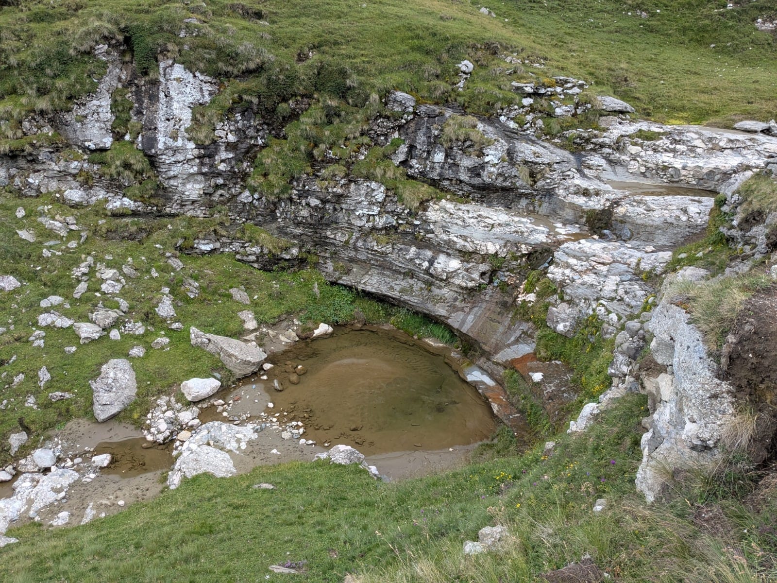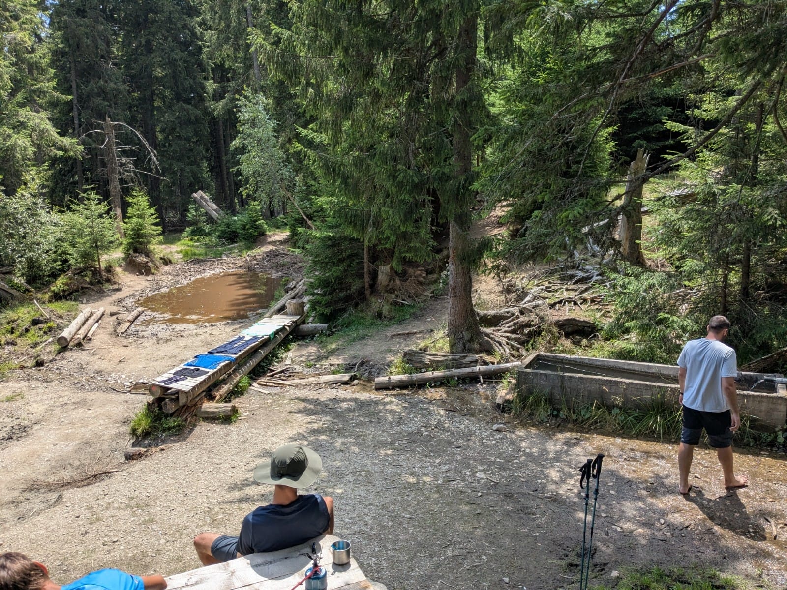 Jelentem, a Caraiman kabana melletti forrásokban nincs víz. Pedig most esett eleget az eső az elmúlt héten. Szárad ki a Bucsecs, sajnos. Találtunk fennebb szép tavacskákat a patakon, töltöttünk vizet, de nem inni, csak tartaléknak. Fennebb a patakon esztena van, meg a Babele turistaparadicsoma, nem inni való ez a víz.
