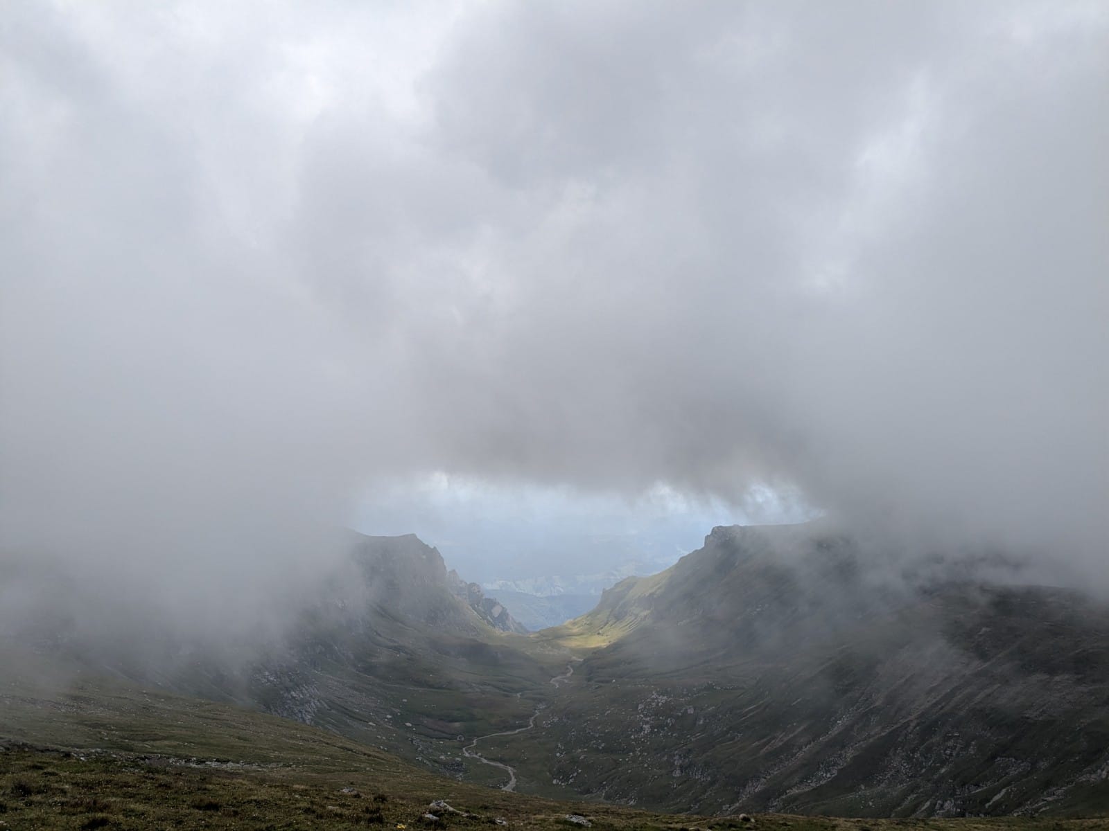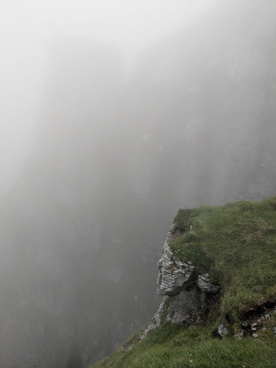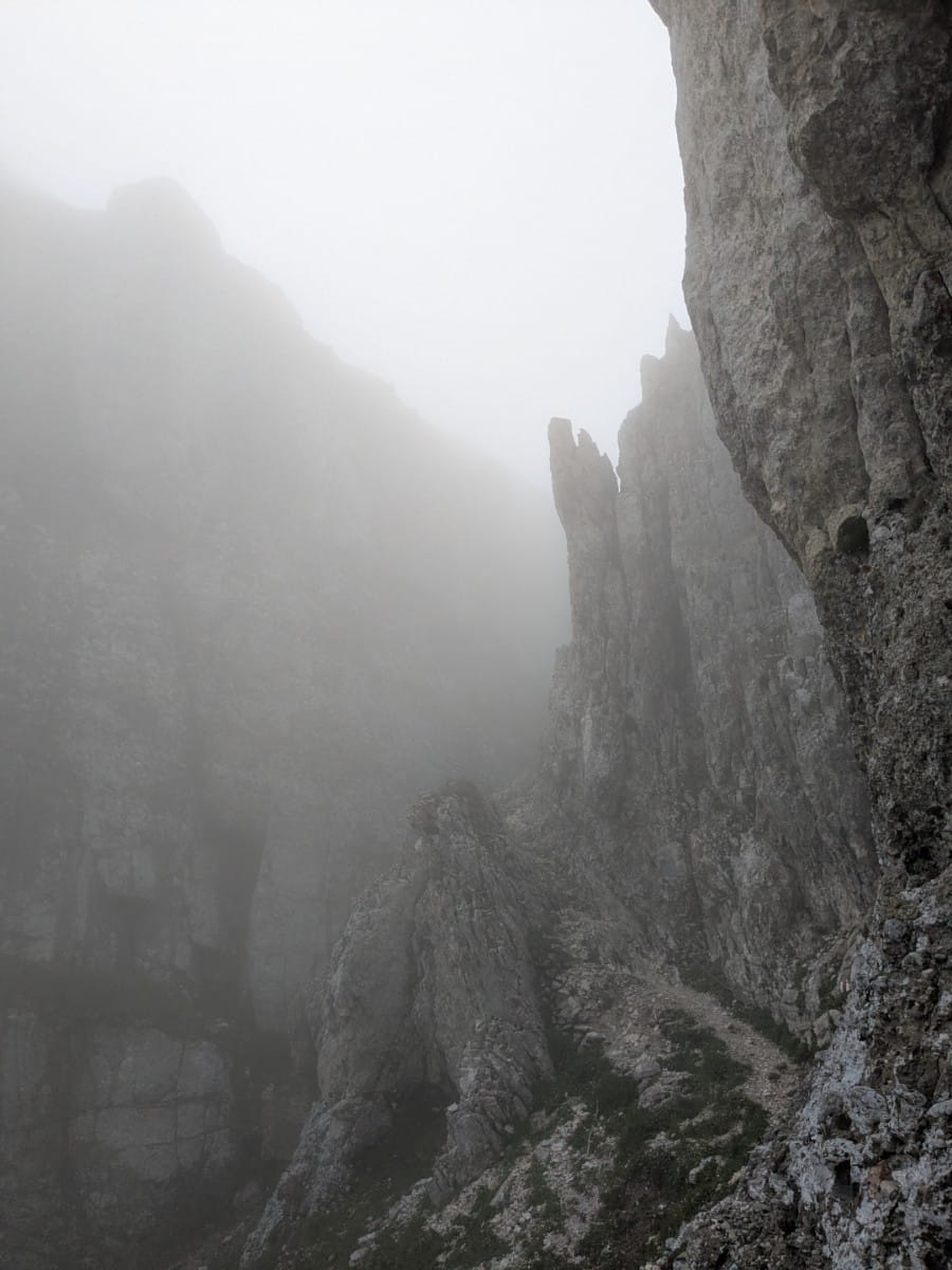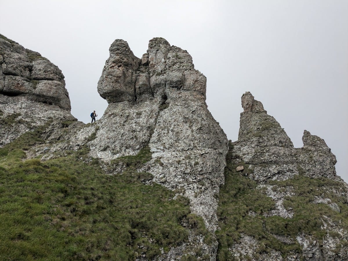 Hatalmas ködben ereszkedtünk alá a Scara csúcsról a Țigănești gerincre. Gyönyörű hangulata volt a ködnek, sejtelmessé tette ezt a vad sziklás tájat.