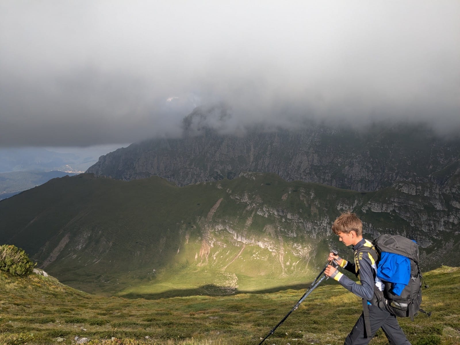 A Fogarasi felé, amerre mi is igyekszünk innen, eső keveredik fényjátékokkal. A kép alján a híres fütyi alakú tisztás látszik, amit Olgi vett észre a tavalyi Jézer-túránkon.