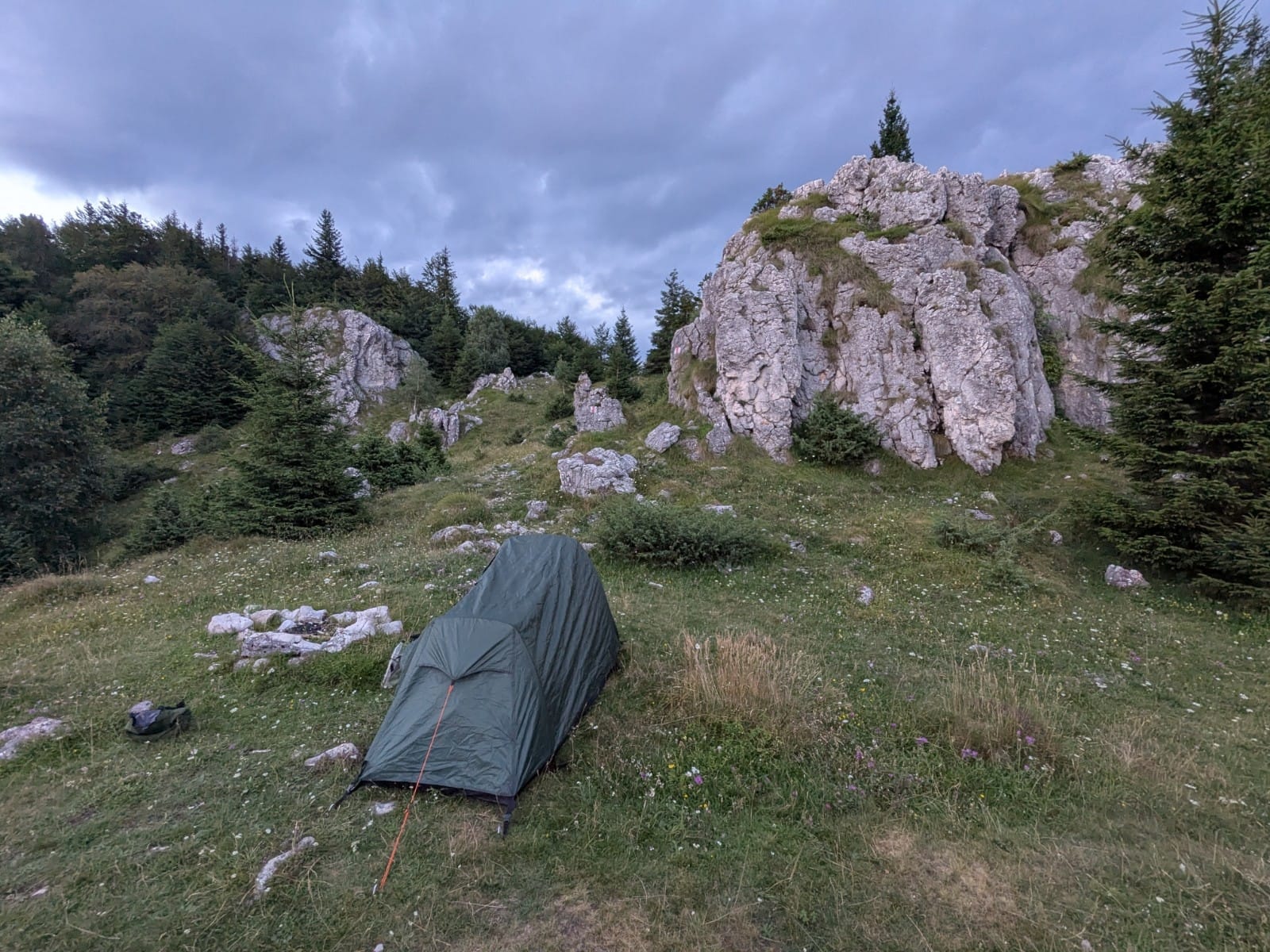 Gyönyörű helyen kapunk sátrazóhelyet, ennél jobb helyen ejsze soha nem sátoroztam. Alattunk-fölöttünk sziklák, pompás panoráma a Királykőre.
