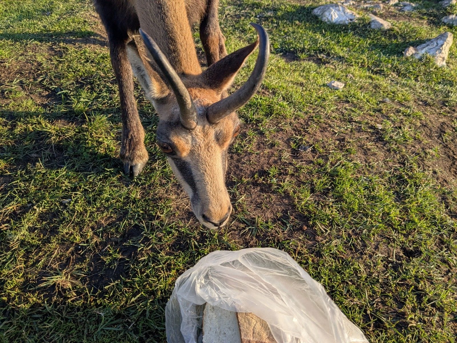Egyik bátor zergének, amelyik közel jön, odadobok egy pici kenyérdarabot. Örömmel felfalja. Aztán sunyin hátulról odalopózik a kenyerünk mögé, s már lopná is el, mikor észreveszem.