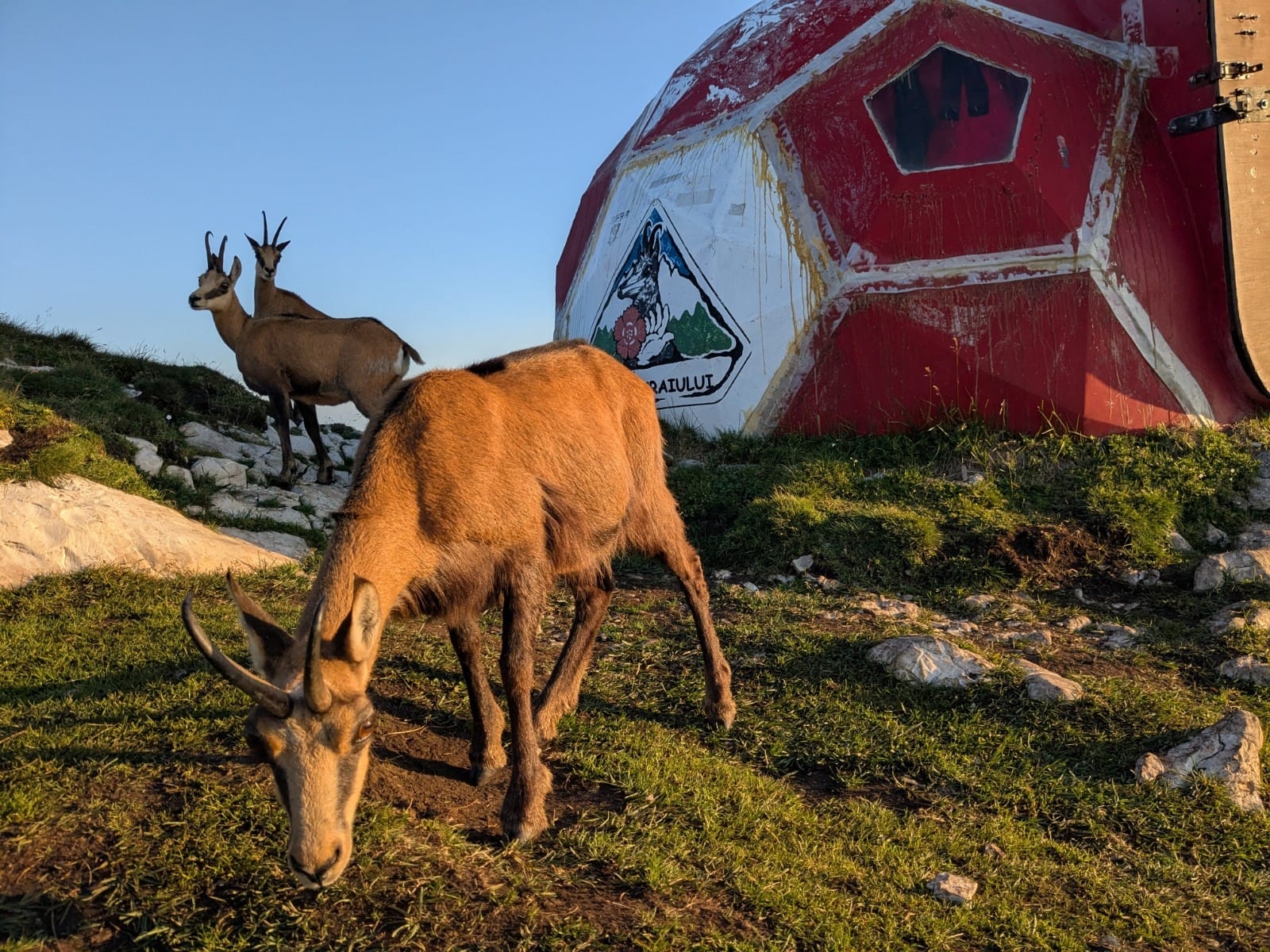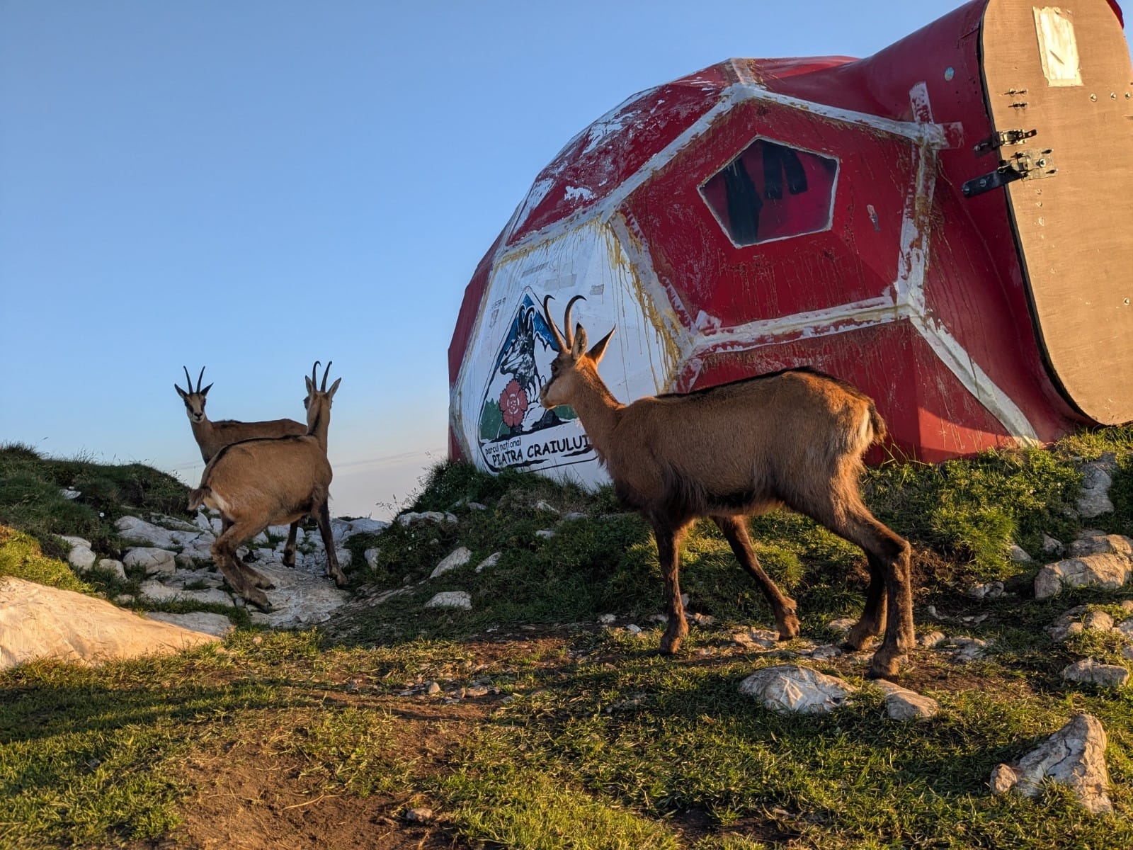 Szerencse hogy nem vagyok szégyenlős, mert miközben a nagyobbik dolgomat végzem, a zergék kukucskálnak. Miután elmegyek, az egyik odamegy, és elkezd szaglászni a legértékesebb termékem iránt. Már-már megtalálja, gyorsan elmegyek, hogy ne lássam mikor felfalja. Nem akarok azzal a képpel megmaradni hogy ez a gyönyörű, cuki teremtés egy szarevő.