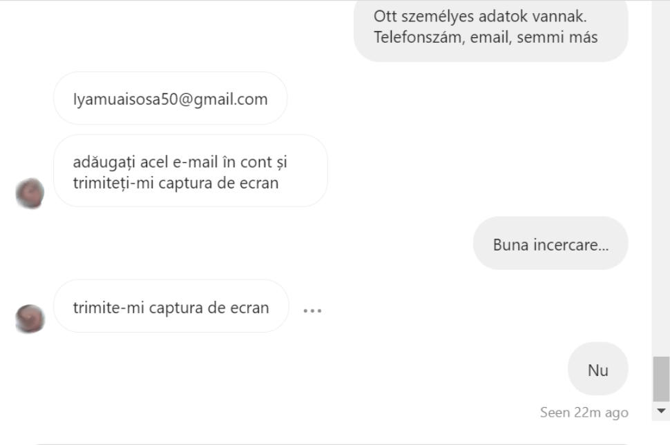 Erre gondolkodás nélkül bevágta a „saját” emailcímét, hogy azt én másoljam csak szépen be az adataim közé, s küldjem róla el a képernyőképet utána. Bár nyilvánvaló volt az átverési kísérlet, melegebb éghajlatra még mindig nem mertem elküldeni, de azért éreztetni akartam vele, hogy tudom, mire megy ki a játék. Ügyes próbálkozás – írtam vissza neki, mire még egyszer bepróbálkozott, már-már parancsolva, hogy küldjem el neki, amit kér. A határozott nemet még látta, de válasz már nem érkezett.