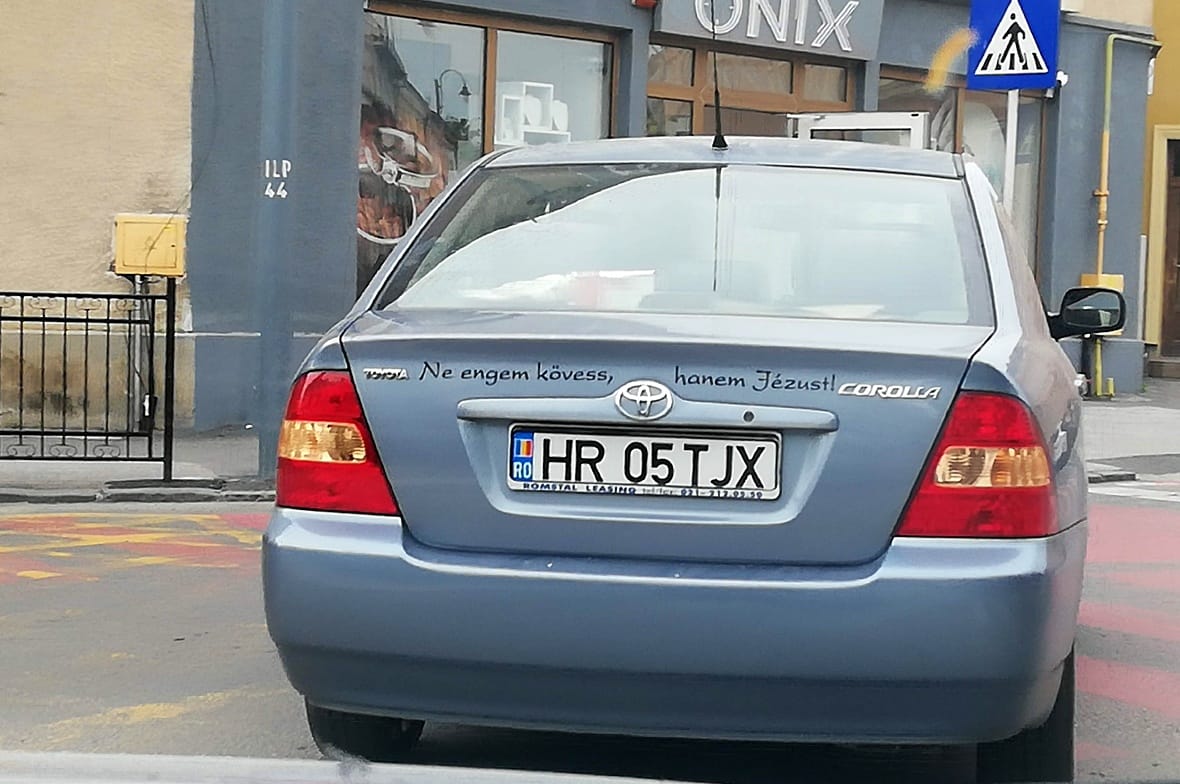 Amikor megtévesztő felirattal közlekedik egy autó a városban, egy sor közlekedési és teológiai kérdést vet fel. Szavazz a szerinted helyes válaszra!