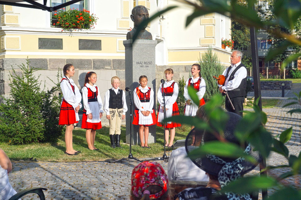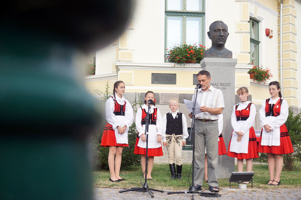 Hamarosan 1902-ből való népdalok törik meg a csendet: szentegyházi gyerekek csoportosulnak a kihelyezett mikrofon mögött. Ezutan Miklós Zoltán múzeumigazgató a Székelyföldi népviseletek Haáz Ferenc Rezső képein címet viselő kiállításról mondja el a megnyitón, hogy