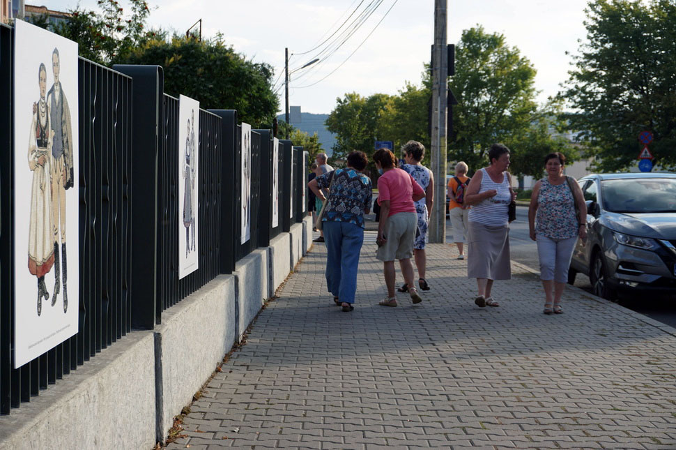 Székelyruhás kislányok sürgölődnek a A Haáz Rezső Múzeum főút felőli udvarán összegyűlt kisebb tömegben, néhányan a kerítésen kívül fotózkodnak vagy elidőznek a néviseletben ábrázolt alakok előtt kedden, augusztus 11-én kicsivel hat előtt.