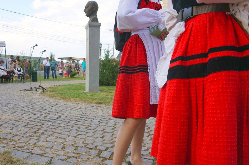 Székelyruhás kislányok sürgölődnek a A Haáz Rezső Múzeum főút felőli udvarán összegyűlt kisebb tömegben, néhányan a kerítésen kívül fotózkodnak vagy elidőznek a néviseletben ábrázolt alakok előtt kedden, augusztus 11-én kicsivel hat előtt.