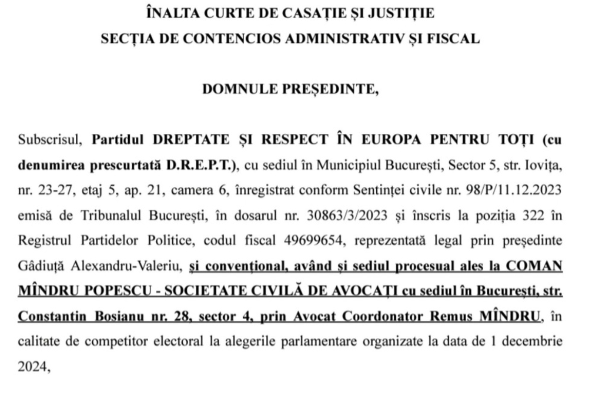 „Épp most kértem a parlamenti választások érvénytelenítését. A parlamenti választásokat is a „hibrid háború” árnyékában tartották, ami miatt az Alkotmánybíróság érvénytelenítette az elnökválasztást. Ezért logikus, hogy minden olyan választást, amelyet a román nemzetbiztonsági intézmények és külföldi partnerek által leírt külső beavatkozások érintettek, meg kell ismételni. Nem igaz?” – írta Vlad Gheorghe pénteken a Facebookon, ahol egy képet is csatolt a Jog és Tisztelet Európai Egységért Mindenkinek (DREPT) párt által a Legfelsőbb Semmítő- és Ítélőtáblához benyújtott kérelemről.