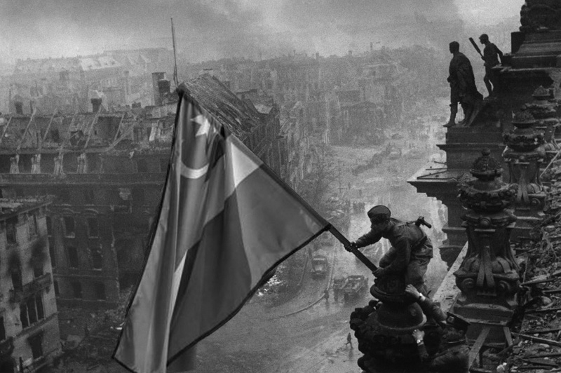 Az eredeti képet 1945 május 2-án készítette Yevgeny Khaldei és a második világháború utolsó mozzanatát, Berlin orosz megszállásának emblematikus pillanatát örökíti meg.