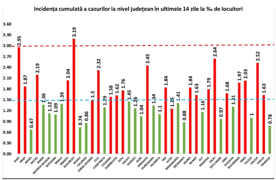 A stirioficiale oldalon az utóbbi 14 napon észlelt ezer lakosonkénti fertőzésszámot megyék szerinti lebontásban is közölték. Mint látható, Hargita megye Bukarest, Fehér, Szilágy és Vâlcea után negyedik a sorban a 2,45-ös aránnyal.