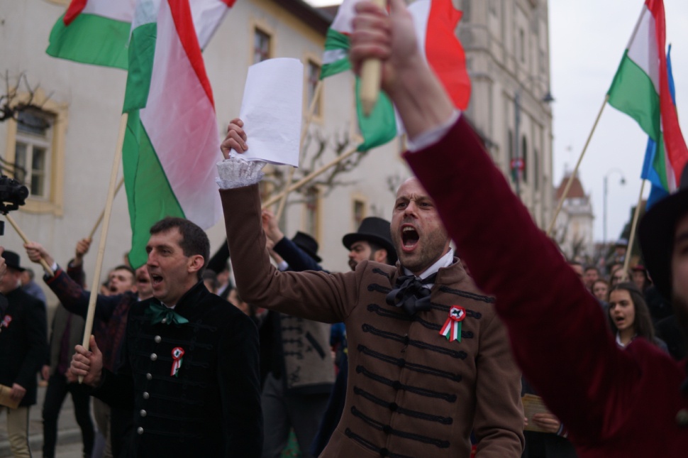 Délután hat órától a forradalom.ma című műsorral várnak a színészek a Márton Áron térre. Tóth Árpád, a Tomcsa Sándor színtársulat tagja felvezetőjében tisztázta: nem beszélhetünk egy koherensen felépített előadásról, inkább egyfajta koncertként vagy rendhagyó történelemóraként nevezné meg az általuk készített március 15-ei emlékműsort. Kicsit olyan lesz, mint egy dokumentumfilm, „elhangzanak a történelmi események, amik tényeken alapulnak, és minden történelmi eseményhez jön egy dal vagy egy vers”, magyarázta a felépítését.