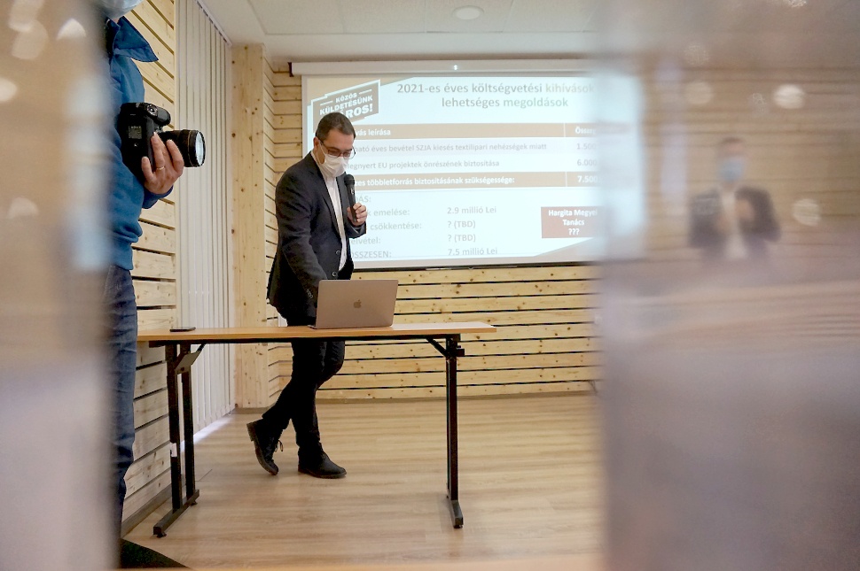 a 2021-ben szükséges 7,5 millió lejből 2,9 millió lej jönne ki az emelésekből, a maradékot pedig költségcsökkentéssel, hitelfelvétellel érnék el. Minimum 1,5 millió lejes csökkentést terveznek, ami elsősorban a polgármesteri hivatalt és alintézményeit érintené. Személyzeti és anyagi jellegű karcsúsításokkal is számoltak, miközben támogatnák, hogy az uniós projektek menedzsmentjét kiszervezze a hivatal – árulta el újságírói kérdésre András Lehel. A döntést a tanács meghozza, a polgármesternek kell megoldania, tette hozzá.