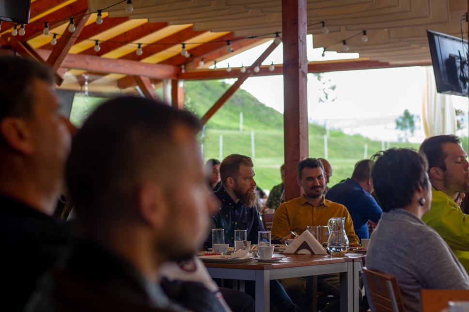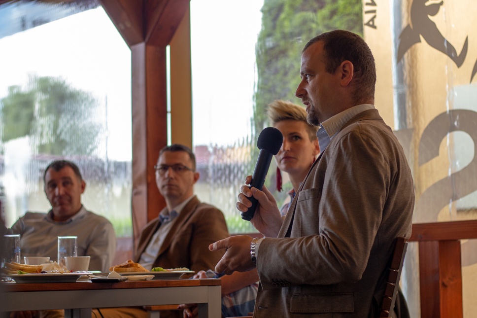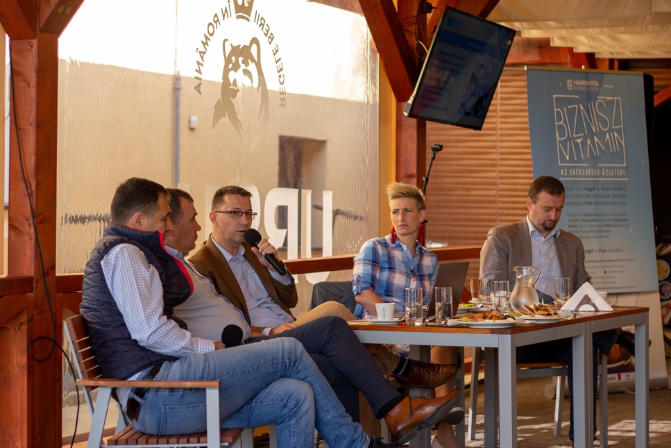 A szerdai Bizniszvitamin főasztalánál a meghívott vállalkozók félkörben várják a mikrofont: Geréb László lesz a karmester, mellette Nagy György, az UKKSZ elnöke, szomszédja András Lehel, a Melinda Instal vezetője, középen az egyetlen hölgy, Sándor-Nagy Julianna rendezvényszervező, az asztal másik végén pedig Péter Szabolcs, az Infopress gazdasági igazgatója, a Schwarz Bistro tulajdonosa foglal helyet.