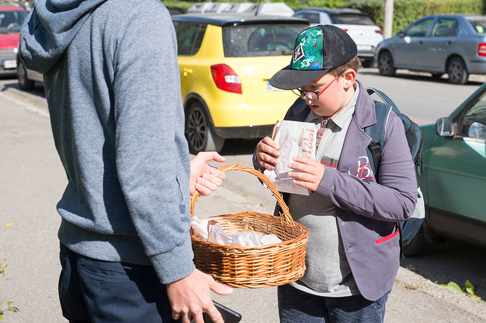 Éppen az iskolából sietett haza, amikor kiszúrt bennünket a kosárral, kíváncsi léptekkel érkezett a finomságok felé.