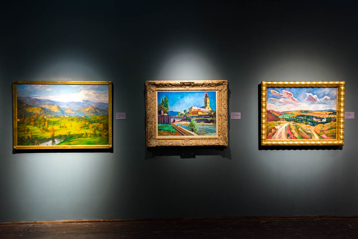 Ferenczy Valér: Tájkép patakkal, máramarosi táj (?), Ziffer Sándor: Zazar-part a református templommal (1947), Mágori Varga Béla: Napsütötte nagybányai táj (1929)