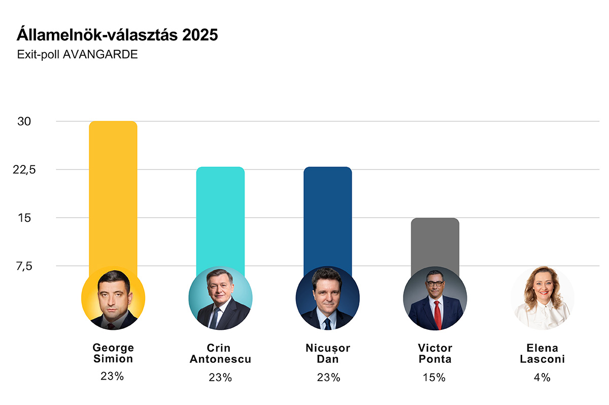 Az Avangarde exit poll felmérése szerint a Románok Egyesüléséért Szövetség (AUR) jelöltje, George Simion a szavazatok 30 százalékát, Nicușor Dan független jelölt és a Románia, előre választási szövetség jelöltje, Crin Antonescu pedig egyaránt a voksok 23 százalékát szerezte meg az államfőválasztás vasárnapi első fordulójában.