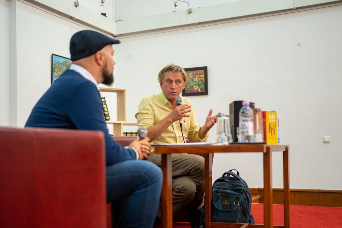 Régészetről, rockzenéről, a magyar faluról, s arról, hogy az író élete csupa nyaralás és szórakozás tudhattunk meg műhelytitkokat Háy János író és Katona Zoltán újságíró kora esti beszélgetéséből a Művelődési Ház Koncerttermében, amit A Könyv Éve Székelyudvarhelyen programsorozat részeként szerveztek meg szombat este.