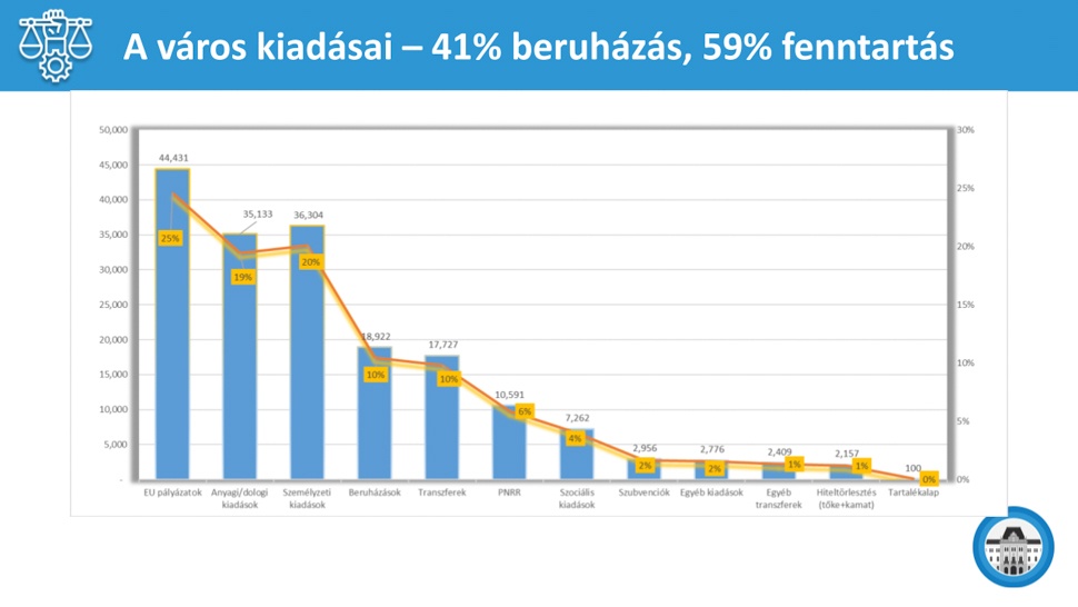 A kiadások úgy oszlanak meg, hogy 59 százalék megy fenntartásra, a maradék 41 százalékot pedig beruházásokra költi a város. Tételenként ebből 25 százalékot tesznek ki az EU-s projektek, 20 százalék megy a személyzeti, 19 százalék az anyagi, dologi kiadásokra. 10 százalék a saját beruházások, 6 százalék PNRR-es pályázatok, hiteltörlesztésre 1 százalék megy, soroltak fel néhányat.