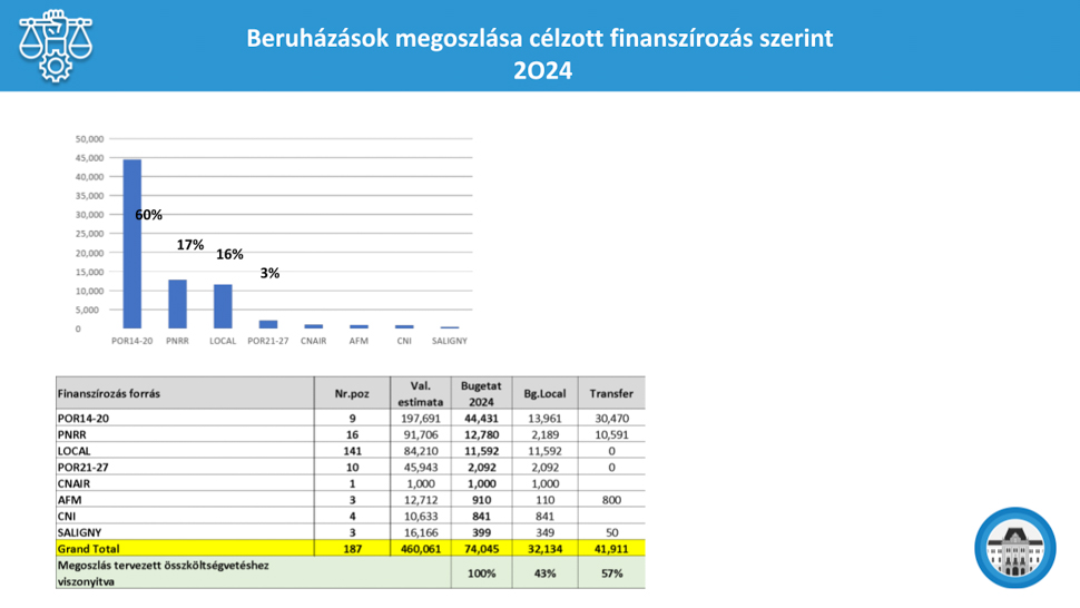 A beruházásokra szánt keretből a saját beruházások 20, a külső források bevonásával végzett beruházások 80 százalékot tesznek ki. Ezen belül a 74 millió lej 60 százaléka a 2014-2020-as uniós pályázati ciklusban megkezdett projektek befejezésére van szánva. 17 százalék a tavaly elindult PNRR-es pályázatok befejezésére, 16 százalék saját beruházásokra (például közvilágítás a Bethlen Gábor utcában, kábelek földbe helyezése), 3 százalék a 2021-2027-es pályázati ciklus új lehetőségeire, itt 10 tétellel is készülnek.