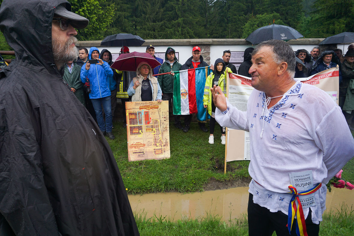 A temetőben meglesz a kritikus tömeg, kitörik a kaput. Véget ér ez a látványos, de felesleges színjáték, a csendőrök a politikusokat félreterelik a kapuból, azok mennek is, szó nélkül. Az egyetlen ember, aki hősiesen ellenáll, és a vérét is adná a temető védelmében, az Pityóka, a fehér bringasisakos ember, akit kétszer arcon is ütnek, teljesen feleslegesen. Az egyik ütése fenti felvételünkön 2:15-nél látszik, a kapuban álldogáló szakállas román úriember röviden behúz egyet neki. Egy óra múlva a csendőrség azt fogja nyilatkozni az országos hírügynökségnek, hogy „Pe timpul desfăşurării evenimentului de la cimitirul din Valea Uzului nu au existat violenţe”. Békés felavatás volt.