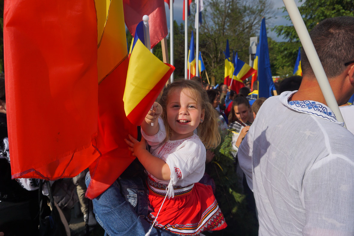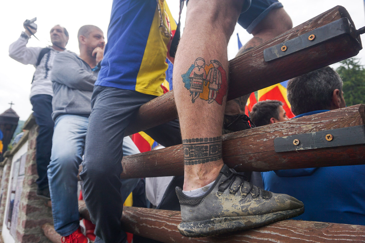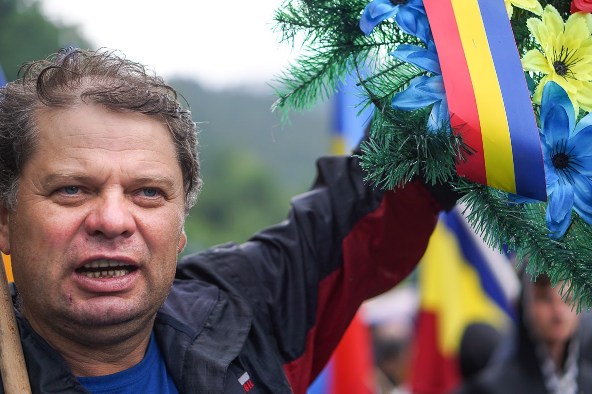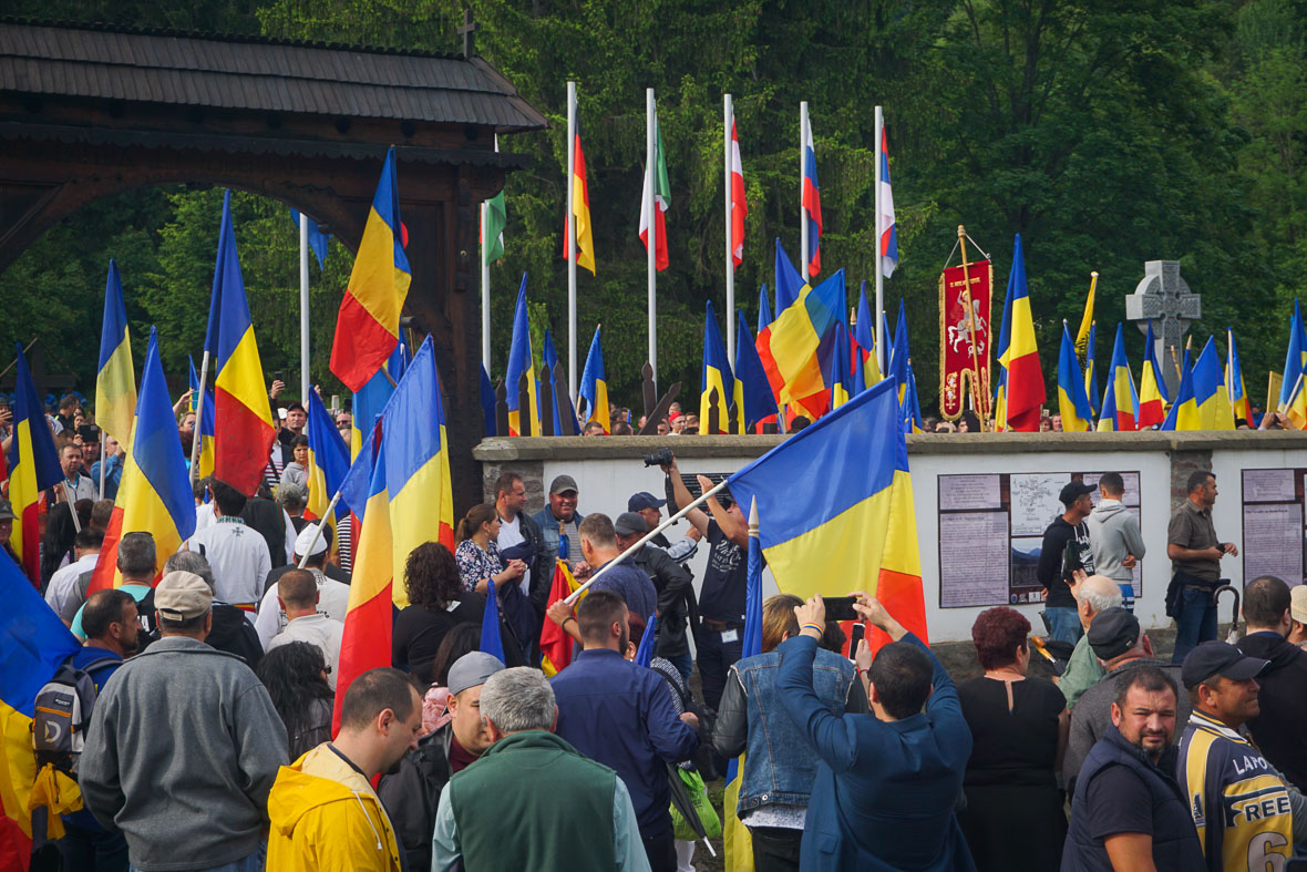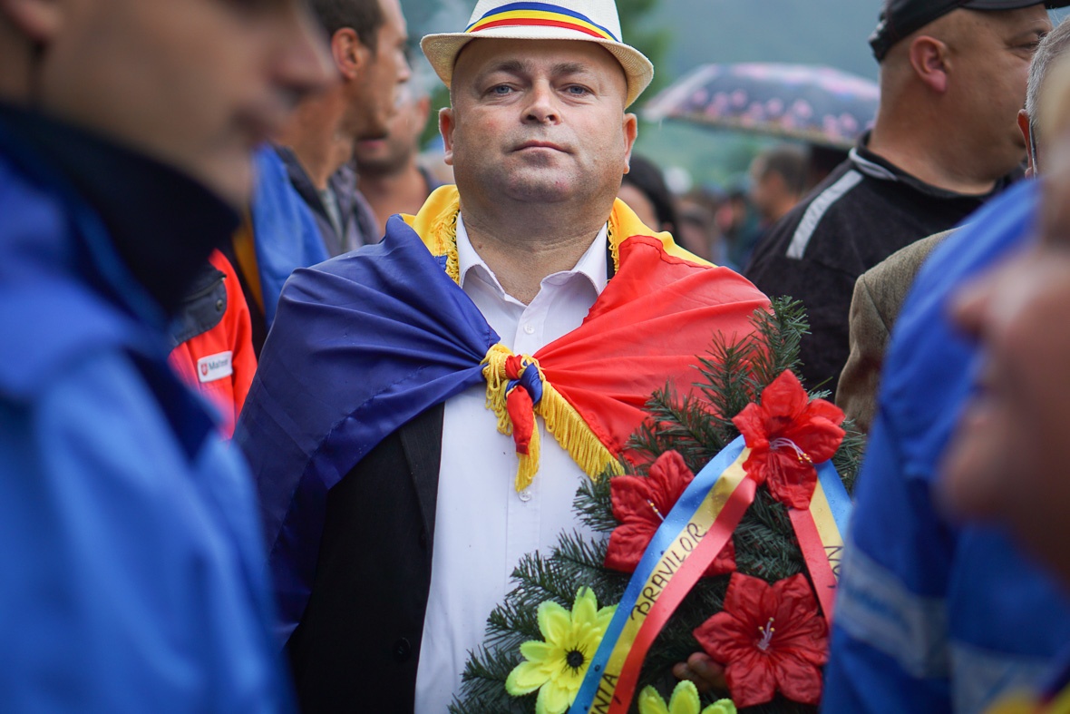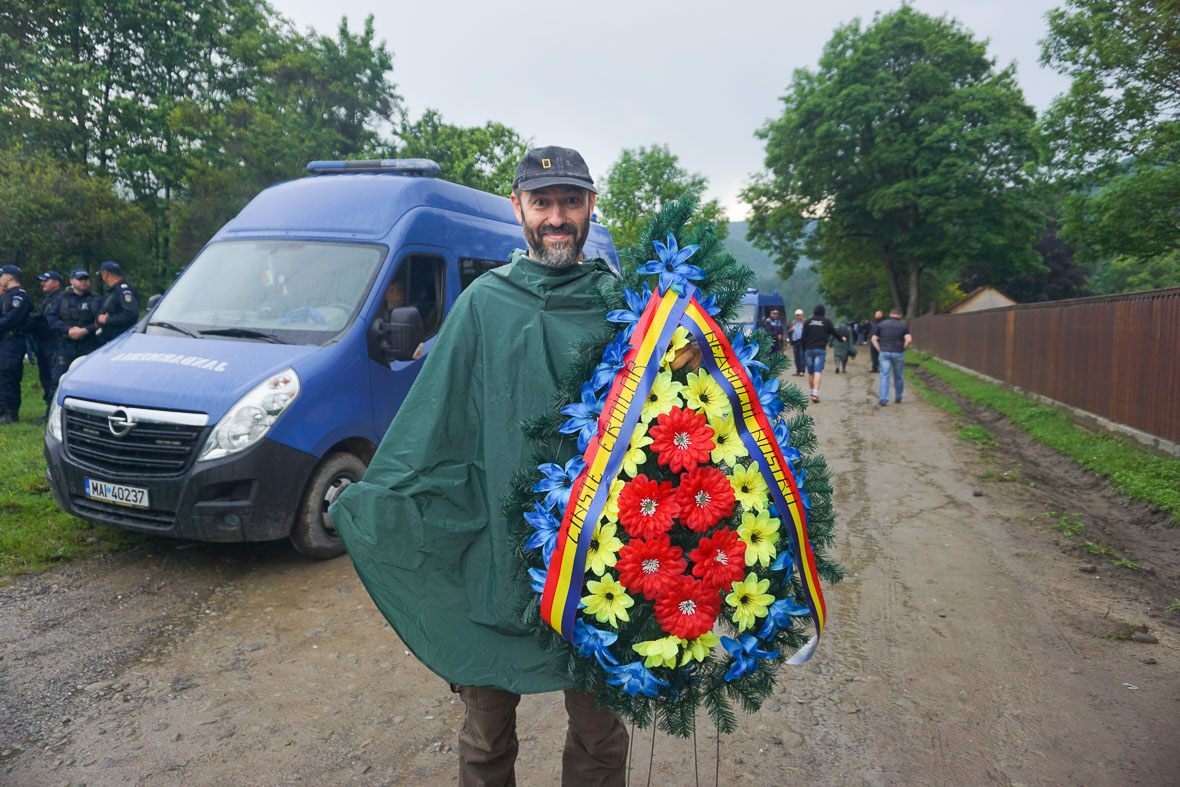 A románok még csak olyan kétszázan lehetnek, és két koszorújuk van. Az egyikbe keményen kapaszkodik a két képpel fentebbi zászlópalástos szuperhős, a másik körbejár. Egy részeg a kezembe nyomja a vándorkoszorút. Kérdem, mit csináljak vele. „Ţine-o şi tu, dacă eşti român!” Azaz tartsam én is, ha román vagyok. Mire elmondanám neki, hogy nem vagyok román, elhúz. Na, zsákmányoltam egy koszorút.