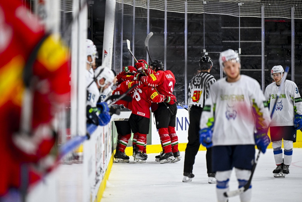 a magyar tábor létszámban és hangerőben is verte az olaszok által megerősített szlovén szurkolókat, a lényeg, hogy a jégen is hasonló volt az állás, próbálkoztak a már feljutott szlovénok, de a magyarok voltak veszélyesebbek, Hári egy kapáslövéssel meg is szerezte a vezetést.