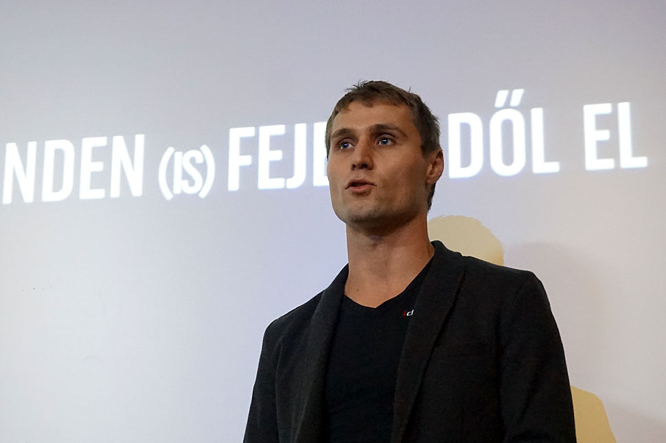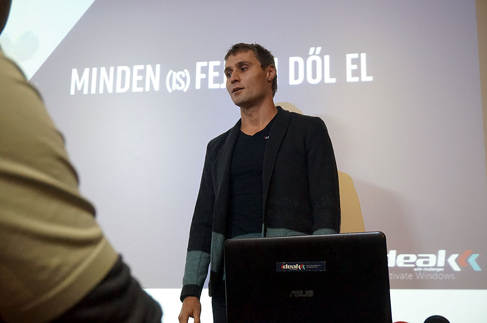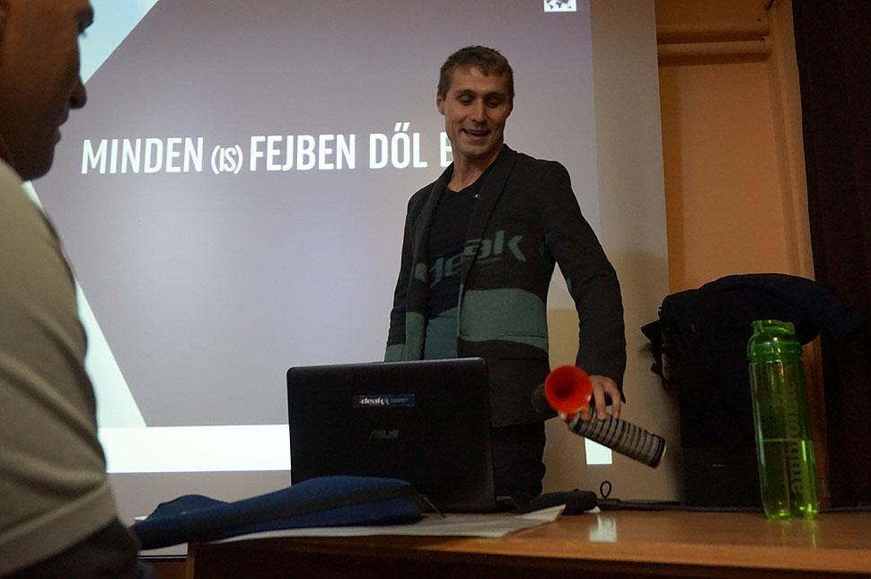 „Deák Zsombor vagyok, ironman. Kicsit úgy állok itt előttetek, mint egy verseny rajtjánál, de azért nem izgulok annyira, mintha 3,8 kilométer úszás, 180 kilométer kerékpár és 42 kilométer futás várna rám, mert ott megszoktam hallani ezt…” – kezdte udvarhelyi előadását a sepsiszentgyörgyi atléta, és váratlanul dudált egy hatalmasat a versenyindító kézi kürttel, garantálva, hogy figyelni fog rá a közönség.