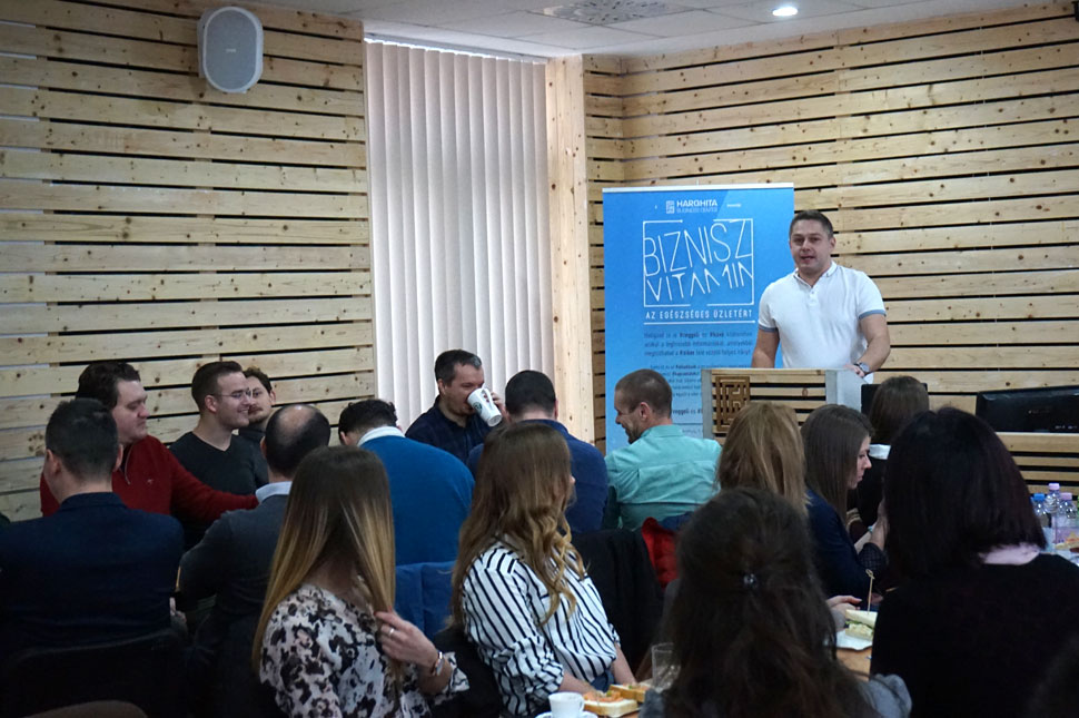 Komoróczy Zsolt Értékek a nagyvállalati kultúrában címmel tartott előadást 2019 második Bizniszvitaminján, amelyhez Tom Cooks biztosította a reggelit: tojásos és lazacos szendvicset.