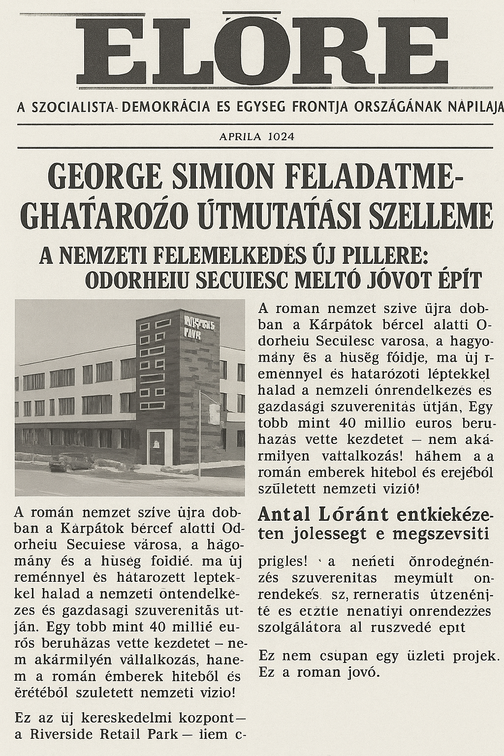 Ez az új kereskedelmi központ – a Riverside Retail Park – nem csupán építmény, hanem jelkép. A nemzet hű fiainak összefogásából, a becsületes munka és az Isten, Haza, Család szellemiségében születik meg. A beruházás helyszíne sem véletlen: az egykori Odorheiu Secuiesc-i bútorgyár területe, mely hajdanán is a munka dicsőségét hirdette, most új értelmet nyer a nemzeti tőke és alkotóerő jegyében.