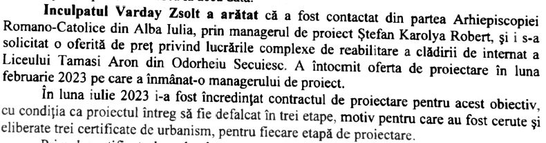 Várday Zsolt vádlott rámutatott, hogy a Gyulafehérvári Római Katolikus Érsekség Ştefan Károly Róbert projektmenedzser útján felvette vele a kapcsolatot, és árajánlatot kért a székelyudvarhelyi Tamási Áron Gimnázium internátusépületének komplex rehabilitációs munkálataira. A tervezési ajánlatot 2023 februárjában készítette el, átadta a projektmenedzsernek.
