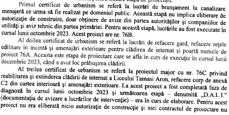 A harmadik urbanisztikai bizonylat a 76C számú nagy projektre vonatkozik, amely a Tamási Áron Gimnázium bentlakásépületének felújítását és bővítését, a belső udvaron lévő C2 melléképület újjáépítését és külső rendezését foglalja magába. E projekt diagnózis szakasza 2023 októberében elkészült, és a következő szakasz – a "D.A.L.I." (a beavatkozási munkálatok jóváhagyására vonatkozó dokumentáció) – előkészítés alatt állt. Erre a projektre nem volt kiadva építési engedély, és a tervezési szerződés sem tartalmazott D.T.A.C. (építési engedélyezési terv) vagy műszaki terv fázist. Pontosít, hogy őt (a tervezőt – szerk.) csak a D.A.L.I. fázisig szerződtették. Nem tudható, hogy mikor történtek volna a következő lépések erre a projektre vonatkozóan, mivel nem volt tiszta, hogy kapnak-e rá a finanszírozást.