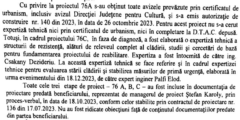 A 76A projekt tekintetében az urbanisztikai bizonylatban előírt összes szakhatósági jóváhagyást sikerült beszerezni, beleértve a megyei kulturális igazgatóság véleményezését is, és 2023. október 26-án kiadták rá a 2023. évi 140. számú építési engedélyt. A projekthez a városháza nem kért szerkezeti szakvéleményt sem az urbanisztikai bizonylatban, sem a kiegészítésként a benyújtott D.T.A.C-.ben. Mégis, a 76C projekt keretében, a diagnosztikai fázisban elkészült egy tartószerkezeti szakvélemény az épületről, az épület teljes felmérése meg a felújítási projektet megalapozó tanulmányok és alapkutatások mellett. A szakvéleményt Csákány Dezső szerkezeti szakértő készítette. Erre a szakvéleményre hivatkozik a 2023.12.18-i eseményt (a bentlakás beomlása –a szerk.) követően Pálfi Előd szerkezeti szakértő által készített, az épület állapotának felmérésére és a szükséges sürgősségi beavatkozásokra vonatkozó tartószerkezeti szakvélemény is.