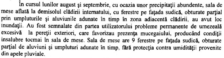 Augusztusban és szeptemberben heves esőzések alkalmával súlyos beázások voltak az internátus épületének alagsorában lévő ebédlőben, melynek a déli homlokzaton lévő ablakai részben el vannak takarva az épület melletti területen idővel összegyűlt töltés és hordalék miatt. Az épület használója rendszeresen előforduló komoly vizesedési problémákat jelzett az étkezde külső falán, ami a penész megjelenéséhez vezetett, egészségtelen körülményeket teremtve éppen az ebédlőben. Az ebédlő déli homlokzatán 9 ablak található, amelyeket részben takar az idővel összegyűlt hordalék és töltés, és melyeknek az esővízzel szembeni védelme nem megoldott.