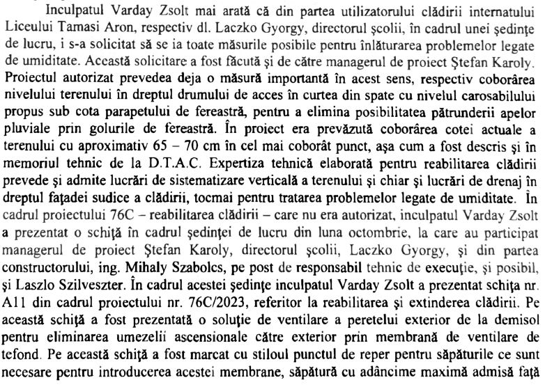 Várday Zsolt vádlott azt is állítja, hogy a Tamási Áron Gimnázium bentlakásépületének használója, Laczkó György iskolaigazgató egy munkamegbeszélésen arra kérte őt, hogy tegyen meg minden lehetséges intézkedést a vizesedéssel kapcsolatos problémák megszüntetésére. Ezt a kérést Ştefan Károly projektmenedzser is megfogalmazta.