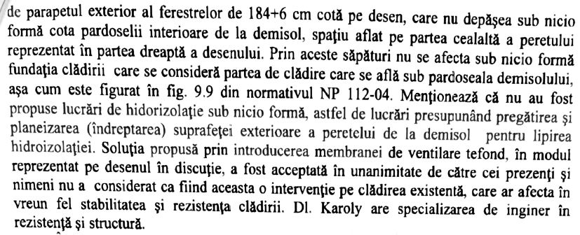 Megemlíti, hogy semmilyen formában nem javasoltak vízszigetelési munkálatokat, ugyanis az ilyen munkálatok a pincefal külső felületének alapos előkészítését és leegyengetését (kiegyenesítését) feltételezik a vízszigetelés felragasztásához. A szellőztető membrán behelyezését javasoló megoldást, ahogyan az a szóban forgó rajzon látható, a jelenlévők egyhangúlag elfogadták, és senki sem tekintette ezt a bentlakás épületén történő beavatkozásnak, amely bármilyen módon befolyásolná az épület stabilitását és tartószerkezeti szilárdságát. Stefan Károly szakképesítése szerkezetmérnök.