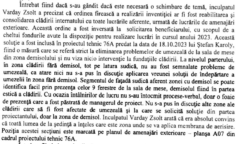 Arra a kérdésre, hogy gondolkodtak-e azon, hogy szükség van-e a tervezési téma megváltoztatására, Várday Zsolt vádlott elmondta, hogy a beruházás természetes sorrendje az lett volna, hogy előbb az internátus épületének felújítása és tartószerkezeti megerősítése valósuljon meg az összes kapcsolódó munkával, ezt kövessék a külső tér rendezési munkálatai. Ezt a sorrendet a beruházó kérésére megfordították, azzal a céllal, hogy a munkálatokra rendelkezésre álló forrásokat 2023 folyamán tudják elkölteni. Ez a megoldás bele volt foglalva a 76A sz. kiviteli tervbe, melyet 2023.10.18-án Ștefan Károlynak átadtak, olyan intézkedésként, ami szigorúan az alagsori részen lévő étkezde nedvességproblémájának megszüntetésére irányul, és semmi olyan beavatkozásról nem szól, ami az épület alapozását érintené. A földszinten, az épület alagsorral nem rendelkező szakaszán, szintén a déli oldalon, nem jelentkeztek nedvességproblémák, így nem is merült fel semmilyen szükséges intézkedés a nedvesség megszüntetésére az alagsorral nem rendelkező épületrészen (ahol az omlás történt – szerk megj.). A déli homlokzat azon szakasza, ahol az alagsor található könnyen azonosítható az ebédlő 9 ablakának alapján, az alagsor az épület keleti részén található. A munkamegbeszéléseken nem készült jegyzőkönyv, csak egy jelenléti ív, amelyet a projektvezető tartott meg. Nem volt szó az épület más részeiről, amelyeket a nedvesedés érintett volna, és amelyekre a tervezőtől megoldást kértek volna, csak az alagsori épületrészről. Várday Zsolt vádlott rámutat, hogy teljesen meg volt győződve arról, hogy a megbeszélésen mindenki megértette, hogy melyik az a zóna, ahol a szellőzőmembránt alkalmazni fogják. A metszeti vonal pozíciója (az A.11 rajzon látható metszet jelölése – szerk. megj.) a 76A sz. kiviteli terv A.07-es rajzlapján, a külső rendezési terven van megjelölve.