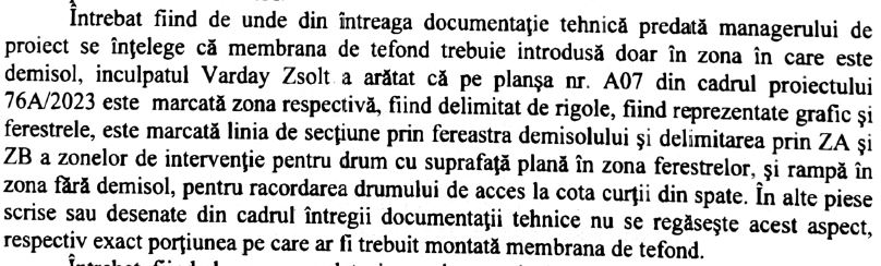 Arra a kérdésre, hogy a projektmenedzsernek átadott teljes műszaki dokumentációból honnan értendő, hogy a tefond membránt csak az alagsorral ellátott részen kell behelyezni, Várday Zsolt vádlott rámutatott, hogy a 76A/2023-as terv A07-es számú tervrajzán be van jelölve a kérdéses terület, le van határolva folyókák által, az ablakok is grafikusan ábrázolva vannak, meg van jelölve az alagsor ablakán keresztülhaladó metszeti vonal, valamint az útra vonatkozó ZA és ZB jelű beavatkozási zónák is, vízszintes útszakasszal az ablakok mentén, illetve lejtővel (rámpával) az alagsor nélküli területen, hogy a bekötőút a hátsó udvar szintjéhez csatlakozhasson.
