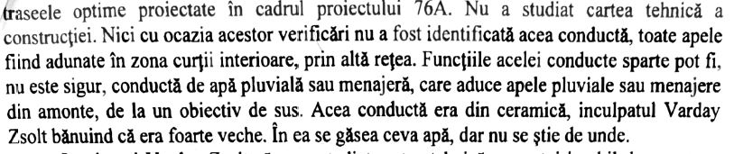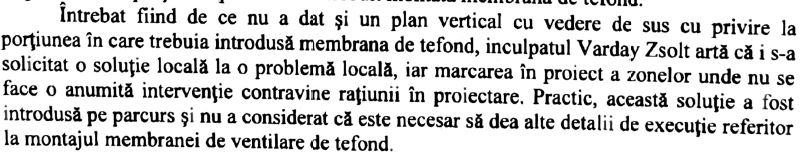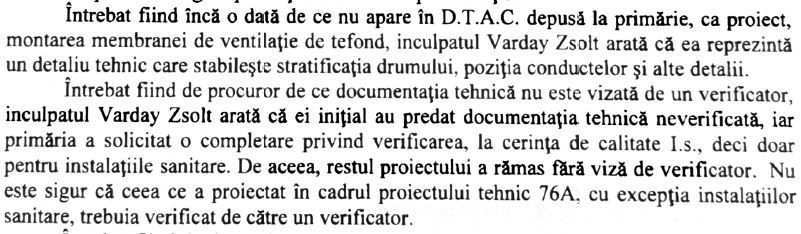 Az ügyész kérdésére, hogy a műszaki dokumentációt miért nem láttamozta tervellenőr, Várday Zsolt vádlott rámutat, hogy ők eredetileg tervellenőrzés nélkül adták át a tervdokumentációt, és az önkormányzat kiegészítést kért az ellenőrzéssel kapcsolatban, az I.s. (instalaţii sanitare – szerk. megj.) minőségi követelményre, tehát csak a vízvezetékekre. Ezért a projekt többi része tervellenőri láttamozás nélkül maradt. Nem biztos abban, hogy a a 76A sz. tervhez tartozó eső- és szennyvízelvezető hálózaton kívül más tervellenőrnek is ellenőriznie kellett volna a tervet.