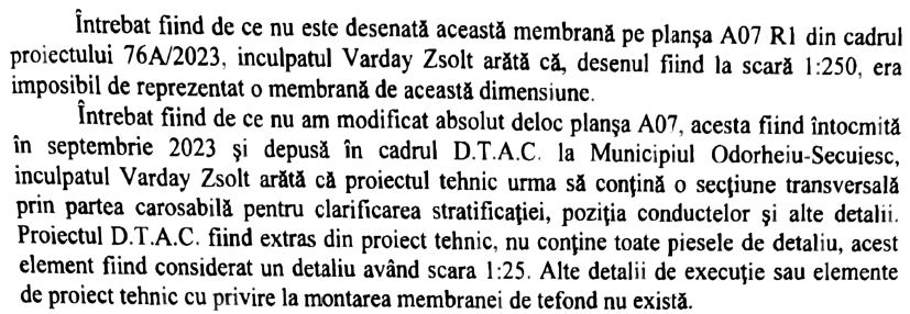 Arra a kérdésre, hogy miért nem módosította egyáltalán az A07-es rajzot, mivel az 2023 szeptemberében volt összeállítva, és a D.T.A.C. keretében Székelyudvarhely önkormányzatánál benyújtva, Várday Zsolt vádlott rámutat, hogy a kiviteli terv mindenképpen tartalmazott volna egy keresztirányú szelvényt az úttesten keresztül, a rétegződés, a vezetékek helyzete és egyéb részletek tisztázása érdekében. A D.T.A.C. terv (építési engedélyezési tervdokumentáció), a kiviteli terv kivonata, nem tartalmazza az összes részletrajzot, és ez az elem a maga 1:25 léptékével részletrajznak minősül. Egyéb kivitelezési részletrajzok vagy kiviteli terv-elemek nem léteznek a szellőző membrán szerelésére vonatkozóan.