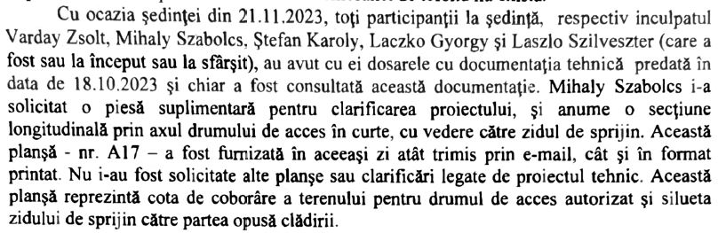 A 2023.11.21-i megbeszélés alkalmával a megbeszélés valamennyi résztvevője, azaz Várday Zsolt vádlott, Mihály Szabolcs, Ştefan Károly, Laczkó György és László Szilveszter (aki vagy az elején, vagy a végén ott volt) számára rendelkezésre állt a 2023.10.18-án átadott műszaki dokumentációt tartalmazó dosszié, és meg is vizsgálták ezt a dokumentációt. Mihály Szabolcs a projekt pontosításához kért még egy tervrajzot, mégpedig egy hosszanti metszetet az udvarba vezető út tengelyén, egy nézettel a támfal irányába. Ezt az A.17-es számú rajzot még aznap e-mailben és kinyomtatva is megküldték neki. A műszaki tervvel kapcsolatos egyéb tervrajzokat vagy pontosításokat nem kértek tőle (a tervezőtől – szerk. megj.). Ez a rajz az engedélyezett bekötőút járószintjének kialakítását és a támfal sziluettjét ábrázolja az épülettel szemben.