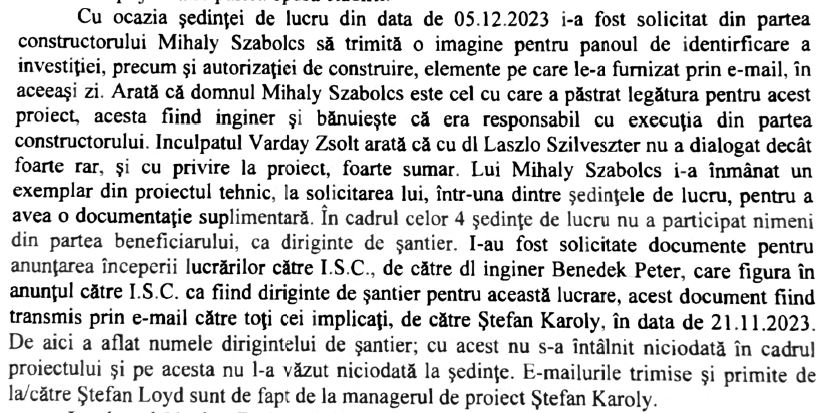 A 2023.12.05-i munkamegbeszélésen Mihály Szabolcs mint az építő képviselője kérte tőle, hogy küldjön egy képet a beruházás azonosító táblájához és az építési engedélyt is, amit még aznap e-mailben elküldött. Rámutat, hogy Mihály Szabolcs úr az, akivel tartotta a kapcsolatot a beruházás kivitelezése kapcsán, mérnök lévén azt gyanítva, hogy a kivitelező részéről ő volt az építőtelep kinevezett műszaki felelőse. Várday Zsolt vádlott jelzi, hogy László Szilveszterrel nagyon ritkán beszélt, és a projekt kapcsán csak nagyon röviden. Az egyik munkamegbeszélésen Mihály Szabolcs kérésére átadta neki a műszaki terv egy példányát, hogy egy plusz (saját) tervdokumentációval is rendelkezzen. A 4 munkamegbeszélésen a megrendelő részéről senki nem vett részt mint műszaki ellenőr (diriginte de santier). Dokumentumokat kértek tőle (a tervezőtől – szerk megj.) a munkálatok megkezdésének bejelentéséhez az I.S.C.-nél Benedek Péter mérnök úr részéről, aki az I.S.C.-nek szóló bejelentésben úgy szerepel mint ennek a munkálatnak a műszaki ellenőre, ezt a dokumentumot Stefan Károly úr 2023.11.21-én e-mailben elküldte minden érintettnek. Innen tudta meg a műszaki ellenőr nevét, a projekt keretében soha nem találkozott vele, és soha nem látta őt a megbeszéléseken. A Stefan Loydnak/tól küldött és kapott e-mailek valójában Stefan Károly projektmenedzsertől származnak.