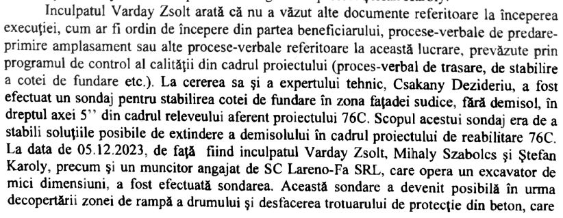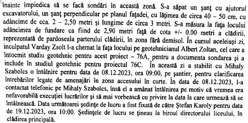 Várday Zsolt vádlott azt állítja, hogy nem látott semmilyen más, a kivitelezés megkezdésével kapcsolatos dokumentumot, mint például a megrendelőtől kapott munkakezdési utasítást, a munkaterület átadásáról készült jegyzőkönyvet vagy a projekt minőségellenőrzési programja által előírt, a munkával kapcsolatos egyéb jegyzőkönyveket (kitűzési, alapozási szint meghatározási stb. jegyzőkönyvek). Az ő és a tartószerkezeti szakértő, Csákány Dezső kérésére egy földtani feltárást (szondázást) végeztek az alapozási szint megállapítására a déli homlokzatnak az alagsor nélküli területén, a 76C projekthez készült felmérésen jelölt 5" tengelyben. A feltárás célja az volt, hogy meghatározzák az alagsor kibővítésének lehetséges megoldásait a 76C épületfelújítási projekt keretében. 2023.12.05-én, Várday Zsolt vádlott, Mihály Szabolcs és Ștefan Károly, valamint a Lareno-Fa Kft. egyik alkalmazottjának jelenlétében, aki egy kis kotrógépet kezelt, elvégezték az alapfeltárást. A feltárás elvégzése lehetővé vált a beton védőjárda feltörése és az út termőrétegének eltávolítása nyomán, ami korábban megakadályozta a feltárást ezen a területen. Egy kb. 40-50 cm széles, kb. 2-2,5 méter mély és körülbelül 3 méter hosszú szondát ástak a markoló segítségével, a homlokzat síkjára merőlegesen. Megmérték a helyszínen az alapozás mélységét, 2,90 méter volt az alagsor nélküli részen az épület +/- 0,00 méteres szintjéhez képest, ami az épület földszinti padlószinjét jelenti. Ugyanezen a napon Várday Zsolt vádlott a helyszínre hívta Albert Zoltán geológust, aki a geotechnikai tanulmányt készítette ehhez a (76A) projekthez, hogy dokumentálja a feltárást és építse be azt a 76C projekt geotechnikai tanulmányába. Azon a napon megbeszélt egy találkozót Mihály Szabolccsal 2023.12.08-án 09:00 órára, az építőtelepre, hogy tisztázzák az udvar bejárati részén lévő tereprendezéssel kapcsolatos kérdéseket. 2023.12.08-án telefonon felvette a kapcsolatot Mihály Szabolccsal, de ez a találkozót elhalasztotta azzal az indokkal, hogy az időjárás kedvezőtlen a munkálatok végzéséhez, és hogy később beszéljenek a találkozó időpontjáról. A következő munkamegbeszélés időpontját Ștefan Károly 2023.12.19-én 10:00 órára tűzte ki. A munkatalálkozókat a gimnázium igazgatójának irodájában tartották a főépületben.