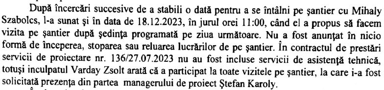 Miután többször is megpróbált időpontot egyeztetni Mihály Szabolccsal, hogy az építőtelepen találkozzanak, felhívta őt 2023.12.18-án 11:00 óra körül is, amikor ő azt javasolta, hogy a másnapra tervezett megbeszélés után látogassák meg az építőtelepet. Nem volt értesítve semmilyen formában az építőtelepen zajló munkálatok megkezdéséről, leállításáról vagy újrakezdéséről. A 136/27.07.2023. sz. tervezési szolgáltatási szerződés nem tartalmazott tervezői művezetői szolgáltatást, mégis Várday Zsolt vádlott rámutat, hogy az összes építőtelepi látogatáson részt vett, amelyekre Ştefan Károly projektmenedzser a jelenlétét igényelte.