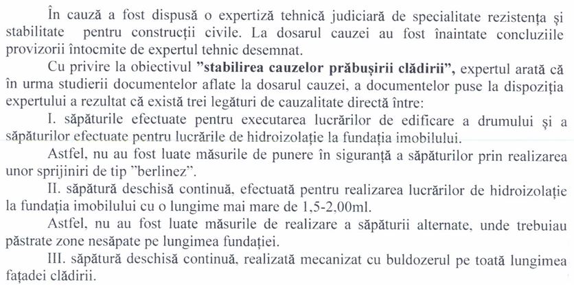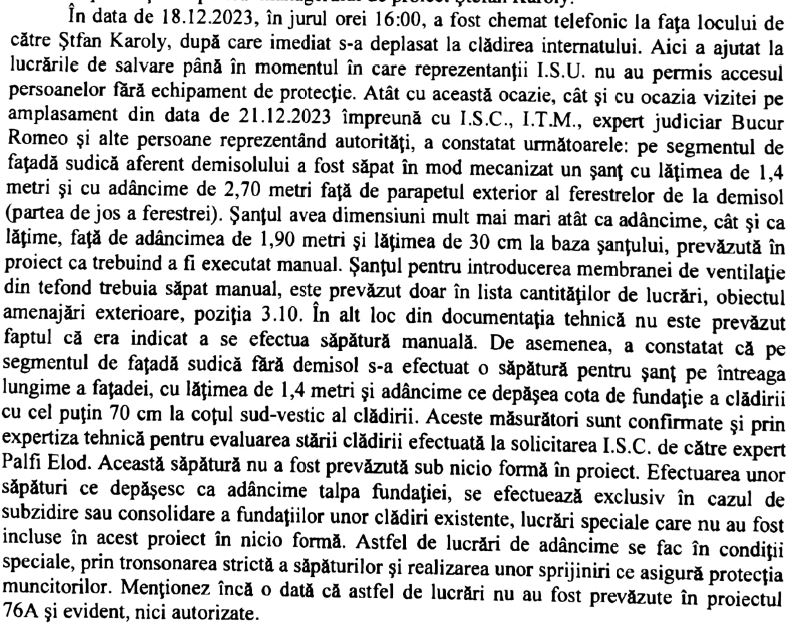 2023.12.18-án 16:00 óra körül Ștefan Károly hívta a helyszínre, és azonnal az internátus épületéhez ment. Itt segített a mentési munkálatokban addig a pillanatig, amíg az I.S.U. képviselői már nem engedték be a védőfelszerelés nélküli embereket. Mind ez alkalommal, mind pedig a helyszínen 2023.12.21-én az I.S.C.-vel, az I.T.M.-vel, Bucur Romeo igazságügyi szakértővel és más, a hatóságokat képviselő személyekkel együtt tett látogatás során a következőket észlelte: a déli homlokzat alagsoros szakaszán az alagsori ablakok külső párkányához (az ablak alsó részéhez) viszonyítva 1,4 méter széles és 2,70 méter mély sáncot ástak gépi ásással. A sánc mind mélységében, mind szélességében jóval nagyobb volt, mint az 1,90 m mélységű és az alján 30 cm szélességű sánc, melyre a tervben kézi ásás volt előírva.