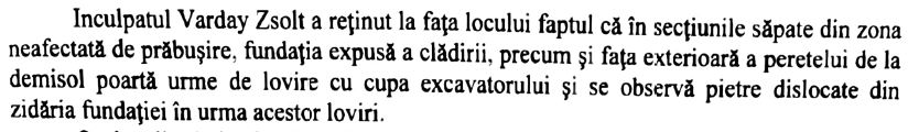 Várday Zsolt vádlott a helyszínen megállapította, hogy az omlás által nem érintett épületrészek mentén kiásott sáncszakaszokban az épület szabaddá vált alapozásán, valamint a pincefal külső felületén a markolókanál ütéseinek nyomai láthatók, és az alap falazatából az ütések következtében kimozdult kövek figyelhetők meg.