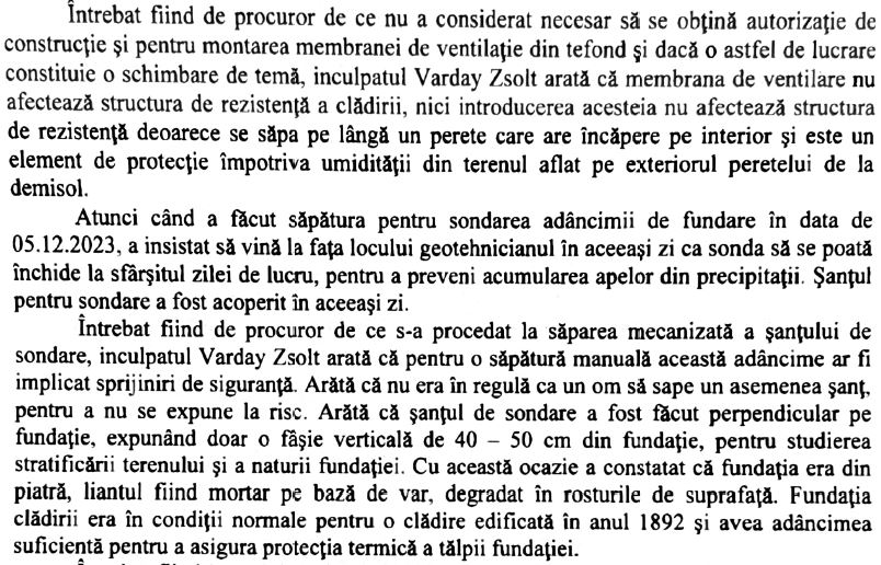 Cikkünk második felében Várday Zsolt kiegészítését közöljük majd. Mint minden érintett fél, a kivitelező, a beruházó vagy a projektmenedzser esetében is, az építésznek is szerettem volna megadni a lehetőséget, hogy elmondja saját álláspontját. Átküldtem Várdaynak az ügyészségi dokumentum szövegét, és felajánlottam neki, hogy ha szeretne ehhez valamit hozzátenni, vagy megcáfolni, vagy helyesbíteni, vagy bármi, akkor tegye meg. Élt a lehetőséggel, küldött válaszként hat oldalnyi román nyelvű hivatalos hangvételű érvelést, amelyben megcáfol és kiegészít néhány dolgot, ami az ügyészségi dokumentumban szerepel. A közérthetőség érdekében kértük, hogy foglalja össze magyarul is a tartalmát. Ezzel zárjuk anyagunkat.