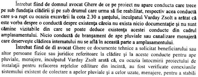 Ghere ügyvéd úr kérdésére, hogy miért nem szerepel a tervben az épület alapja alatt és a felújítandó út alatt futó cső, vagyis az a cső, amely a sánc 2,30 m-es mélységében az ásási munkák során eltört, Várday Zsolt vádlott rámutatott, hogy ez egy olyan cső, amelynek a létezéséről nincs dokumentáció, és nincsenek olyan aknák, amelyekből következtetni lehetne a helyszínen ennek a csőnek a létezésére. Az internátus épületét kiszolgáló egyetlenegy csapadékvíz- vagy szennyvízvezeték sem található a helyszínnek ezen a részén.